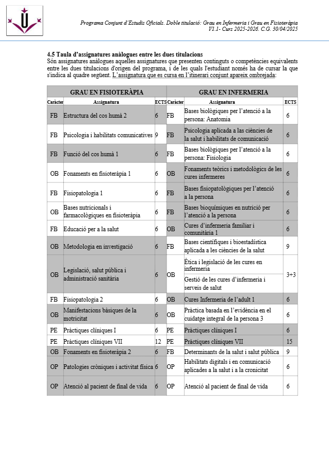 DOBLE TITULACIÓ: GRAU EN INFERMERIA I GRAU EN FISIOTERÀPIA